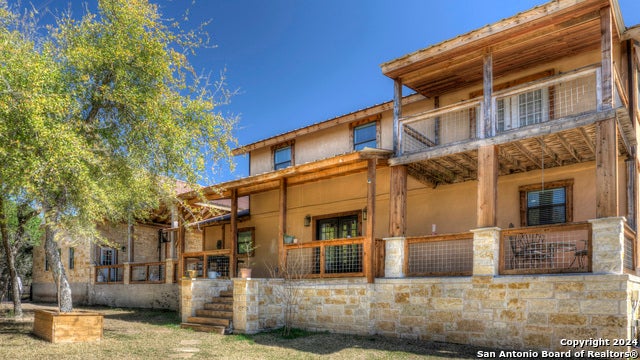 This spacious home with Mediterranean design was built in 2014, encompasses 2760 of living space and sits on a sprawling 2.8 acres. The interior features an open kitchen/dining area with concrete countertops, a center island, a bar with additional seating, and stainless-steel appliances, including a gas range and under-counter beverage cooler. The primary suite blends comfort and luxury with a seating area, walk-in closet, and French doors that lead to a private second-story balcony where you can enjoy the stunning views of the surrounding hills and the pool below. The primary bathroom is thoughtfully designed with dual vanities and a walk-in shower featuring dual shower heads and a glass enclosure. The study is adjacent to the primary suite, and the additional three bedrooms offer plenty of living space. Step outside to discover a large, covered deck, perfect for entertaining while surrounded by breathtaking views. The fenced backyard features a sparkling custom pool with a waterfall feature to cool off on those long hot days. The gated entrance and wooded estate provide ample privacy. RV hook-up, 2-car attached carport, 2-car attached garage.