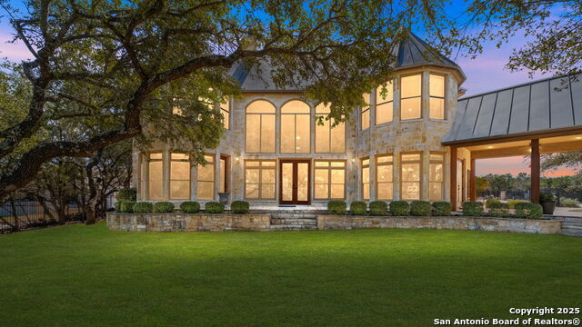 Experience the serenity and luxury of this exceptional 4-bedroom, 4.5-bathroom home in the highly desirable River Crossing subdivision. Spanning 4,907 sq ft, this beautiful residence is designed to offer both comfort and elegance, with soaring ceilings, expansive windows, and stunning stone accents, both inside and out. A grand double-door entry opens to the spacious interior, featuring beautiful wood flooring in the living room and a stunning ceiling-high wood-burning fireplace, creating a warm and inviting ambiance with an open-concept floor plan. The primary suite is conveniently located downstairs, offering a spa-like ensuite with double vanities, a large soaking tub, a separate walk-in shower, and dual walk-in closets. Upstairs, you'll find three spacious bedrooms, two of which showcase tall, beautifully accented wood ceilings and a flex room perfect for a game room, media room, or home office. The wet bar area is also located on the second floor offering additional convenience. The chef's kitchen is a culinary dream, complete with gas cooking, a large island, custom cabinetry, and plenty of counter space for meal prep. Two eating areas provide ample space for dining and entertaining. Step outside to the covered patio or front porch overlooking the one-acre fenced lot with mature trees and gated access, providing privacy and security. Additional features include a separate utility room, hidden storage under the staircase, and an attached two-car garage. Located in the sought-after Smithson Valley High School district, this home is a true Hill Country gem, offering a perfect blend of peaceful living and luxurious amenities.