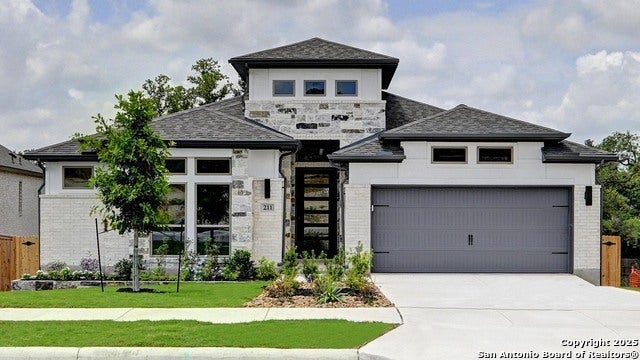 Entry welcomes with 12-foot ceiling. Game room with French doors and 12-foot ceiling off extended entry. Kitchen and dining area open to spacious family room with wall of windows. Kitchen hosts inviting island with built-in seating space. Primary suite includes bedroom with 12-foot ceiling. Double doors lead to primary bath with dual vanities, freestanding tub, separate glass-enclosed shower and two walk-in closets. Abundant closet space and natural light throughout. Extended covered backyard patio. Mud room off three-car garage.