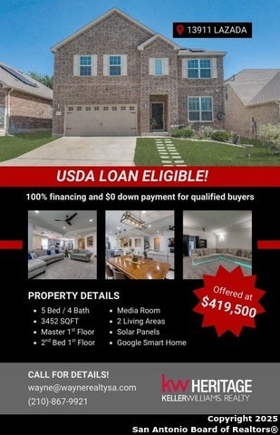 **Welcome to 13911 Lazada - A Spacious 5-Bedroom Home with Modern Luxuries & a Private Movie Theater!** This stunning 5-bedroom, 4-bathroom home offers the perfect blend of comfort, style, and functionality. Thoughtfully designed with both entertaining and everyday living in mind, the layout includes multiple flexible spaces ideal for a home office, entertaining, or relaxing in privacy. **Main Level Highlights:** - Step into a long entryway that opens into a beautifully designed layout. - A bedroom and full guest bathroom provide convenience for visitors or multi-generational living. - The enclosed laundry room with built-in shelving keeps your space tidy and organized. - A charming breakfast bar nook-referred to by the builder as the "planning room"-adds a stylish and functional touch. - The open-concept kitchen features quartz countertops, a designer tile backsplash, and a large island ideal for casual dining or entertaining. - Flowing seamlessly from the kitchen are the dining and living areas, perfect for gatherings. - The private master suite is tucked away for serenity, complete with a spa-like ensuite bathroom including a garden tub, walk-in shower, dual vanities, and a spacious walk-in closet. **Upstairs Features:** - A spacious loft offers the perfect spot for a game room or lounge area. - Three additional bedrooms and two full bathrooms provide plenty of room for family or guests. - Enjoy cinematic experiences in your dedicated media/theater room, outfitted with surround sound speakers for immersive movie nights. **Additional High Tech Perks:** - Solar panels for energy efficiency and lower electric bills. - Security system through Surety (monitoring available at $22/month). - Google Smart Home integration for lighting, security, and climate control. With high ceilings, generous square footage, and modern upgrades throughout, **13911 Lazada** offers the ideal balance of luxury and practicality-perfect for anyone seeking a stylish, tech-savvy, and comfortable place to reside.