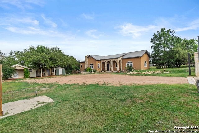 This charming single-story gem offers 3 spacious bedrooms and 3 bathrooms, all in a modern layout built in 2017, with easy access to Hwy 281 and only minuets away from Canyon Lake! You'll love the open floor plan that flows effortlessly into a 3/4 wraparound deck-perfect for relaxing or entertaining. Need extra space? A cozy guest house with its own full bathroom (336 additional sq ft!) is ideal for visitors or a private retreat. There's even a convenient storage shed for all your extras. The property is fully fenced and features a striking stone and metal gate at the front, offering both enhanced privacy and eye-catching curb appeal.