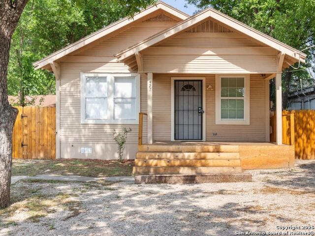 Built in 1922 and thoughtfully updated, this single-family residence offers approximately 768 square feet of living space on a 0.115-acre lot. The property features 2 bedrooms, 1 full bathroom, a covered front porch, and a fenced backyard with mature trees. The interior offers an open-concept layout with vinyl plank flooring throughout, fresh interior paint, and updated ceiling fans in the living room and bedrooms. The living area includes a new AC window unit with heating capabilities. The kitchen has been renovated with a new gas stove, refrigerator, updated cabinetry, and a decorative tile backsplash. A separate utility room accommodates a washer and dryer setup. Each bedroom includes an individual AC window unit and a ceiling fan for climate control. The bathroom features new fixtures, a shower/tub combination, vinyl flooring throughout the home. The exterior includes a driveway and additional front parking space. Located near Woodlawn Lake, San Antonio College, San Pedro Springs Park, major highways, and downtown San Antonio, the property offers convenient access to shopping, dining, and recreation. The property will be sold as-is.