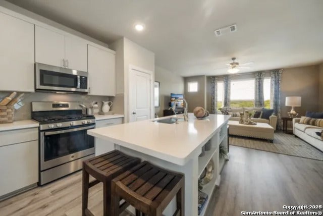 Two-story home featuring 3 bedrooms, 2.5 baths, a game room, and an attached 2-car garage. Enjoy a Texas-sized family room that overlooks the eat-in kitchen. The second-floor master suite has separate his and her vanities, a walk-in closet, PLUS a walk-in shower. The first floor features 2 secondary bedrooms, a full bath, and a game room. You also have side entry ability from the outside to the game room for guests, friends, and family! Close to UTSA, Medical Center, USAA, and La Caterra Mall.