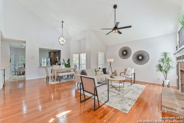 Welcome to your next home in the heart of Stone Oak - one of the area's most sought-after communities. This beautifully updated residence blends warmth, functionality, and charm, with a layout designed for everyday comfort and effortless entertaining. From the moment you step inside, you'll be captivated by soaring ceilings and abundant natural light that flows seamlessly through the open living spaces. A cozy, wood-burning fireplace anchors the main living area, creating the perfect spot to unwind at the end of the day. The primary suite is conveniently located on the main level, offering privacy and easy access.Outside, enjoy your own backyard oasis with an expansive patio - ideal for morning coffee and weekend BBQs. The home's classic brick exterior and generous front lawn add timeless curb appeal. Recent upgrades throughout introduce fresh style and modern touches, making it move-in ready.This home comes with all the perks of living in Stone Oak, including access to a community pool, basketball courts, tennis courts, playgrounds, and nearby hiking trails - perfect for all ages and lifestyles. You'll also appreciate being just minutes from top-rated schools, golf courses, shopping, dining, hospitals, and major highways, with easy access to the airport. Whether you're seeking tranquility or connectivity, this home delivers the best of both worlds in one of San Antonio's most desirable and well-established neighborhoods!