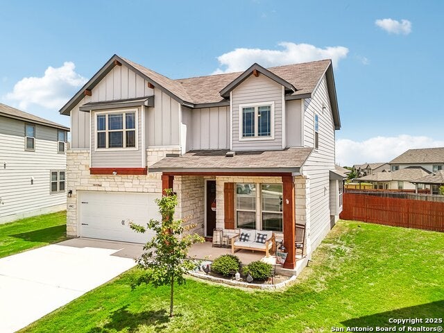 OPEN HOUSE 06/07 10AM-12PM Ideally located just 15 minutes from Randolph AFB and 25 minutes from Fort Sam Houston, this beautiful home shows like new construction while feeling like home, with added charm and customizations. Enjoy excellent curb appeal, a spacious driveway, and a welcoming covered patio-perfect for morning coffee or quiet evenings. Inside, the layout is open and inviting with lots of natural light. The kitchen is a standout with its dark wood cabinetry, generous island, and ample space for entertaining. The primary bedroom offers a retreat-like feel with a stylish wood-paneled accent wall, a spa-like ensuite bathroom, and a spacious walk-in closet. The loft and dedicated movie theatre room add a touch of luxury to everyday living. The large, fully fenced backyard with an extended patio and large pergola offers the perfect environment for hosting friends, or family night around a fire pit. Feel like getting out of the house? Take a short walk up the street to the community pool and playground! Asher Place is conveniently located near I-10 and 1604 giving you easy access to all essential amenities. This home offers an assumable 4.875% VA Loan, for those who qualify.