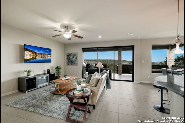 Welcome to this exceptional home in the gated Mountain Lodge community, offering panoramic views of the city skyline the moment you walk in. This property is packed with upgrades, including a brand-new roof (2025) and a Keith Zars sports pool and spa (2023) with a 1-year warranty, gas heating, an AquaStar ozone cleaning system for minimal chlorine use, shallow ends on both sides, and built-in outlets for a volleyball net. The outdoor living is unmatched, with an elevated patio featuring a gas outlet for grilling and xeriscape landscaping for low-maintenance enjoyment. Inside, the open-concept design highlights expansive windows, a multi-sliding glass door, and a chef's kitchen with granite countertops, gas cooking, stainless steel appliances, and an oversized island. The main-floor primary suite offers tray ceilings, skyline views, and a spa-like bath with dual vanities, garden tub, and walk-in shower. Upstairs includes a game room, three spacious bedrooms, and two full baths. Additional features include a tankless water heater for endless hot water, an Aprilaire whole-house purifier, ARC-TECH Pro electrical and surge protection, and a rented water softener in place since 2015. Residents enjoy two neighborhood pools, sports courts, playgrounds, and community events, all with top-rated NEISD schools and no city taxes.