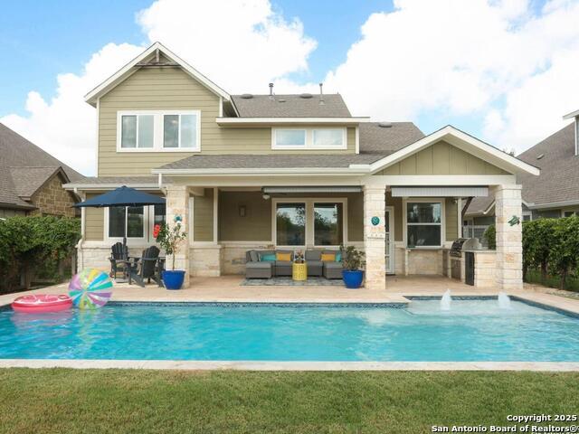 Welcome to your next home in the desirable Crossvine neighborhood! Step inside to soaring ceilings and an inviting living area anchored by a striking stone fireplace. The large kitchen boasts sleek granite counters, stainless steel gas appliances, and a spacious island that seamlessly connects to the living space-perfect for gatherings. Upstairs, you'll find three roomy bedrooms and a versatile game room, ideal for relaxation or play. The primary suite is conveniently located on the main floor and features an expansive walk-in shower and a massive closet, offering a true retreat. Enjoy outdoor living year-round on the extended covered patio, complete with a built-in grill and beverage refrigerator. A sparkling, in-ground pool with bubblers, enhanced landscaping, and sunshades provide both privacy and comfort, making this backyard perfect for entertaining. Discover the perfect blend of comfort, style, and community in this exceptional home! Residents enjoy access to resort-style amenities, including a swimming pool, playground, park, jogging trails, sports court, clubhouse, lake and more. Conveniently located near Randolph Air Force Base and local schools, and walking distance to Founders Classical Academy Charter School, this home combines comfort, privacy, and a vibrant community lifestyle. Community amenities include a sparkling pool, modern clubhouse, jogging and walking trails, sports courts, and more-everything you need for an active lifestyle. This property is listed on the MLS and available for immediate showings. Don't miss your chance to own this exceptional, move-in ready home in one of the best neighborhoods.