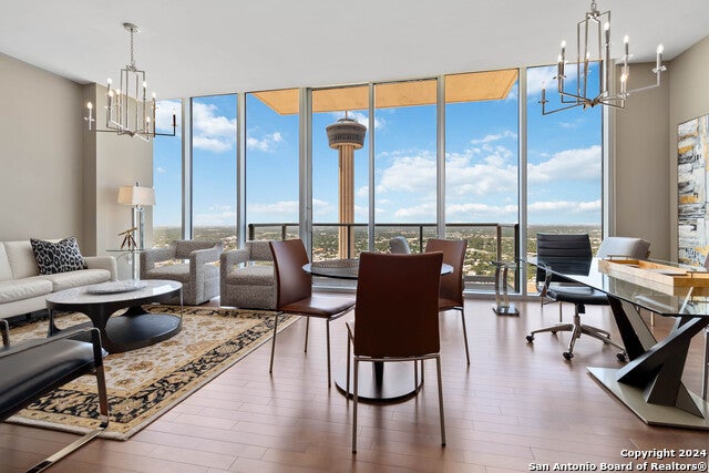 Exquisite high rise living! This 2 bedroom condo is move in ready, located in the Alteza Condominiums in the heart of downtown San Antonio and offers spectacular city views. Floor to ceiling windows offer breathtaking views of the iconic Tower of Americas, the Alamodome and the downtown skyline. Beautiful wood floors and elegant lighting fixtures. Kitchen equipped with high end, stainless steel appliances and tons of cabinet space. Spacious primary bathroom with oversized walk in shower and jetted tub. Private rooftop pool with hot tub and lounge area, large 24 hr fitness center. 24hr concierge & 2 reserved parking spots!