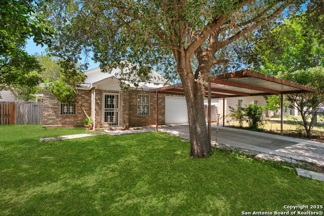 Charming one-story brick home featuring 3 bedrooms, 2 full baths, a 1-car garage plus a 1-car carport. Inside, a spacious entry leads to the spacious living room and flows perfectly into the galley kitchen and dining area-perfect for everyday living and entertaining. The backyard offers mature shade trees, a covered patio, with a privacy fence, but plenty of room to expand the backyard. Metal structure is prepped to add covering and expand patio. Storage shed conveys. With close proximity to Downtown San Antonio and quick access to Loop 410 and I-37, this home is ideal for first-time buyers or a growing family seeking convenience and room to grow.