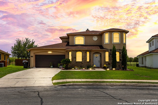 Assumable FHA loan at 2.65 rate. Experience the best of Texas living in this magnificent two-story Spanish-style home, gracefully positioned on a lush golf course. From its charming stucco and stone exterior to its spacious 5 bedrooms and 2.5 baths, every detail exudes curb appeal and comfort. 5th bedroom on main level can be flex office space. Primary Bedroom on main level. Roof is 4 years old. A dedicated two-car garage provides ample parking, while the prime location offers unparalleled access to major highways and the Toyota Plant and Palo Alto College, simplifying your daily routine without sacrificing the tranquility of golf course living. Amenity center with Pool, Basketball Court and walking trails throughout!
