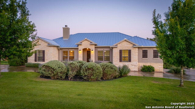 Discover this exceptional custom home providing elegant living in the guarded community of Copper Ridge. The living area boasts a striking rock fireplace and offers stunning views of the lush hill country surroundings. The spacious primary suite features a private bathroom with a luxurious walk-in shower, a relaxing garden tub, and dual vanities. Generously sized secondary bedrooms, along with a versatile flex space-ideal for a game room or home gym. The custom kitchen, open to living area designed for entertaining, includes a large 5 burner gas cooktop, walk-in pantry, and custom cabinetry. Step outside to a backyard retreat shaded by majestic live oaks with covered patio and firepit area designed for enjoyment and gatherings. Workshop out back for storage or special projects can also be used for golf cart parking. A slice of hill country living can be yours. This property has recently undergone significant enhancements to include a new metal roof as well as fresh coats of paint on both the exterior and interior surfaces.