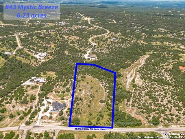 Welcome to 843 Mystic Breeze - a stunning 6.23-acre homesite located in the heart of the Texas Hill Country within the coveted Mystic Shores community. This spacious and gently sloping lot offers panoramic views, beautiful sunsets, and a mix of open meadow and mature oaks, providing an ideal setting for your dream home, vacation getaway, or long-term investment. With paved road frontage and utilities at the property, the property offers multiple level build sites and excellent flexibility for your custom design. Surrounded by upscale homes on acreage lots, the location offers a perfect blend of natural beauty and peaceful Hill Country living. Mystic Shores is one of the premier communities on Canyon Lake, known for its thoughtfully preserved landscape and outstanding amenities. Residents and their guests enjoy access to three community parks, including a 26-acre private waterfront park on Canyon Lake and a 140-acre nature preserve filled with walking trails and native wildlife. A resort-style swimming pool is within walking distance of this property, along with a beautifully appointed community center that hosts gatherings, events, and recreational activities. Additional amenities include tennis and pickleball courts, a sports court, private lake access, and boat and RV storage - all designed to elevate everyday living. With no timeline to build and the option to bring your own builder, 843 Mystic Breeze offers both freedom and long-term value. Ideally situated just minutes from Canyon Lake and the Guadalupe River, and within easy reach of San Antonio, New Braunfels, and the Hill Country Wine Trail, this property combines scenic tranquility with everyday convenience. Don't miss this exceptional opportunity to create your Hill Country legacy at 843 Mystic Breeze.