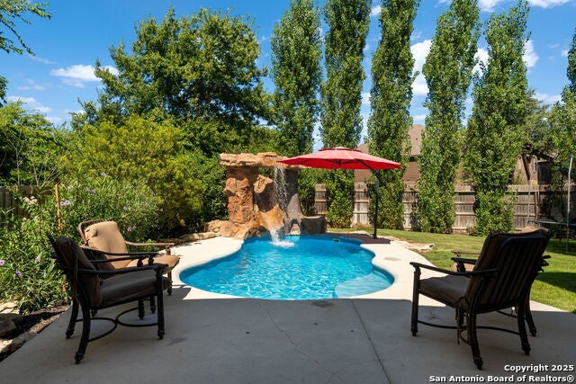 Entertainer's Dream on a Double Lot in Boerne - 385 Derby Dr. Welcome to 385 Derby Dr-a beautifully maintained, one-owner home offering 2,596 sq ft of flexible living space on a rare double lot. Built in 2015 and thoughtfully cared for, this home is truly an entertainer's dream, blending indoor comfort with an incredible outdoor lifestyle. Step into your own private retreat featuring a sparkling pool with slide, built-in outdoor kitchen, and a massive covered patio perfect for hosting gatherings year-round. The huge backyard offers ample room for kids to run and play, with mature shade trees lining the fence for privacy and natural cooling from the Texas sun. The lot backs to a drainage easement, meaning no neighbors behind or to one side, giving you exceptional seclusion. Inside, the open-concept layout connects a stylish kitchen with granite counters and bar seating to the spacious living and breakfast areas, making entertaining a breeze. A formal room at the front of the home can serve as a dining area or second living space. The primary suite is downstairs, along with a second full bedroom and full bath-ideal for guests, multigenerational living, or a home office. Upstairs features a large game or media room, an oversized bedroom, and a full bath-perfect for a teen suite, theater, or bonus space. Additional highlights: Fresh interior paint, Ceramic tile, and carpet flooring, Attached 2-car garage, Flexible floor plan with multiple living and entertaining zones. This home offers the perfect blend of comfort, privacy, and outdoor fun-just minutes from everything Boerne has to offer. Don't miss this rare opportunity to own a home with incredible entertaining potential and family-friendly space. Schedule your private showing today! **Back on market due to buyer unable to secure financing**