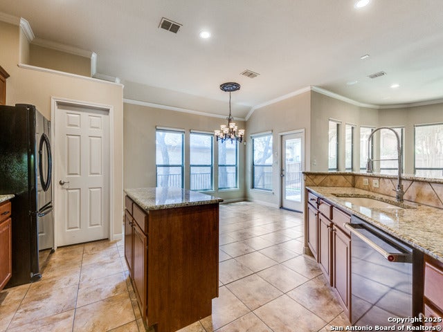 Appliances | Ceiling Fans, Chandelier, Washer Connection, Dryer Connection, Washer, Dryer, Cook Top, Built-In Oven, Microwave Oven, Gas Cooking, Refrigerator, Disposal, Dishwasher, Water Softener (owned), Security System (Owned), Gas Water Heater, Garage Door Opener, Solid Counter Tops, Double Ovens, Custom Cabinets, City Garbage service |