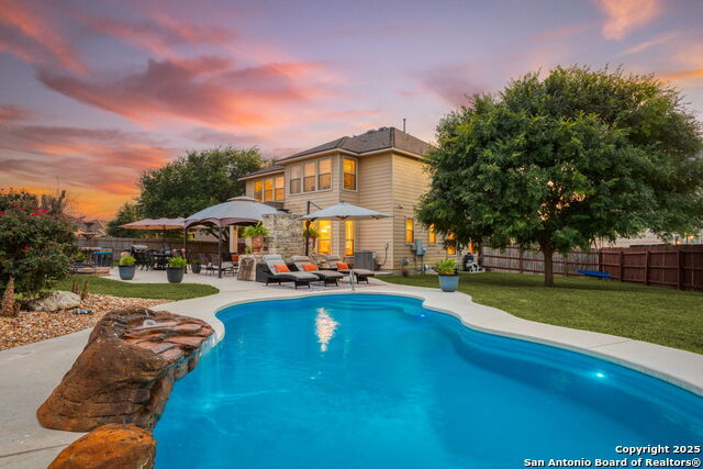 Tucked away on a quiet cul-de-sac in the sought-after gated community of Cobblestone in Northwest San Antonio, this beautifully maintained 4 bedroom 2.5 bath residence offers many upgrades with the perfect blend of space, comfort, and luxury. Situated on an oversized .29-acre lot, this home features an incredible backyard retreat complete with a sparkling pool, a cozy wood-burning fireplace under a covered cabana, multiple outdoor seating areas and ample space for entertaining or relaxing outdoors. Inside, you'll find a thoughtfully designed floor plan with two spacious living areas downstairs and a large game room upstairs perfect for entertaining or family living. The heart of the home is the chef's kitchen, equipped with gas cooking, rich cabinetry, granite countertops, and a large island for gathering. The expansive primary suite offers a peaceful escape with an ensuite bath, while three additional generously sized bedrooms provide plenty of space for family or guests. Enjoy the benefits of a well-maintained home in a gated community known for its resort-style amenities, top-rated schools, and easy access to shopping, dining, and major highways. Recent replacements include roof and AC. See additional documents for complete list up upgrades.