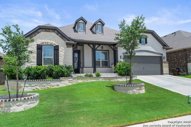 Welcome to 29007 Alldell Way, a beautifully designed one-story home located in the gated community of Kinder Ranch. With 4 spacious bedrooms and 3.5 bathrooms, this home offers a comfortable and open layout with high ceilings, abundant natural light, and thoughtful upgrades throughout. From the lush front landscaping and inviting front porch to the elegant front office with French doors and formal dining room, the home strikes a perfect balance between style and function. The large kitchen features a generous island, ample cabinet space, and flows seamlessly into the living area, where a cozy fireplace adds a warm touch. The primary suite includes a stunning bathroom with a soaking tub, walk-in shower, and separate vanities. Step outside to enjoy your own backyard retreat-complete with a luxurious pool, sun ledge with bubblers and a waterfall, built-in lounge seating, pool heater and chiller, and a drop shade for added patio privacy. Additional highlights include upgraded window treatments, smart thermostat, two overhead storage racks in the garage, a widened driveway, and a 3-car tandem garage. Residents also have the option to access the Kinder Ranch community pool.This home combines comfort, privacy, and elegant outdoor living-ready to enjoy from day one!