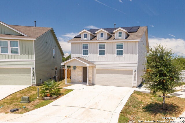 Lovely two story home located in cul-de-sac. Open floorplan with the kitchen, living and dining rooms all flowing together. Great for entertaining. The kitchen boasts stainless steel appliances: gas range, microwave oven, disposal, and dishwasher. Water softener. Wood laminate flooring throughout downstairs. This home has solar panels (negotiable). Upstairs carpeted bedrooms. Primary bedroom with walk-in closet and full bath. Primary bathroom with tub/shower combo. Epoxy floor in two car attached garage. Large backyard with custom built shed in privacy fenced backyard. Easy access to Loop 410 and IH-35. Near shops and restaurants. Minutes to Fort Sam Houston.