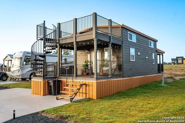 Tucked within the highly desirable Firefly Resort in Fredericksburg, Texas, this thoughtfully designed tiny home offers a unique opportunity to own a luxurious retreat in the heart of the Hill Country. Located just 10 miles from Main Street and surrounded by the vineyards of the famous Highway 290 wine trail, this property is ideal for both personal enjoyment and short-term rental income. The home itself is a masterclass in compact luxury. Inside, you'll find a cozy main-level bedroom, a full bathroom, and a well-equipped kitchen with everything you need to cook and entertain. The upper-level loft accommodates two full-size beds comfortably, making it a great space for families or guests. Every square foot of this tiny home has been maximized to provide both comfort and style. Step outside and the charm continues. A covered front porch with a hanging chair offers the perfect spot to enjoy your morning coffee or a glass of local wine in the evening. Follow the elegant spiral staircase to the rooftop deck, where you can take in the wide-open skies and sweeping views of the Hill Country. And tucked around the back of the home is a private, covered hot tub that makes this property truly feel like a personal spa getaway. Firefly Resort itself is full of amenities that make life easy and enjoyable. Residents and guests enjoy access to a resort-style pool with panoramic views, a modern clubhouse, outdoor kitchen and grill stations, laundry facilities, a business center, a dog park, and a playground. Whether you're looking for a weekend escape, a low-maintenance investment, or a place to call home in one of Texas's most charming destinations, Unit #205 offers it all-style, comfort, and an unbeatable location.