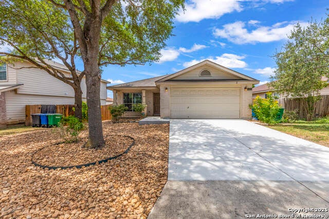 Discover this inviting home located just minutes from Randolph Air Force Base. Recent updates include fresh interior paint, a new privacy fence, and xeriscape landscaping for easy maintenance and curb appeal. Inside, the family room opens to the dining area, creating a spacious and connected living space. The oversized kitchen features an island, ample cabinet space, and flows into a bright breakfast nook - perfect for casual meals. The primary suite is tucked away at the rear of the home for added privacy and includes a separate shower, garden tub, and a generous walk-in closet. This home offers comfort, convenience, and thoughtful updates-schedule your showing today!