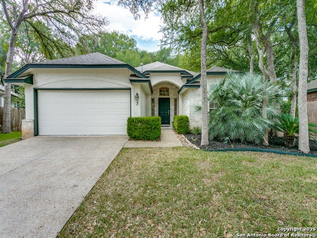 Charming single-story stucco home nestled in a quiet cul-de-sac within a small, gated community. The beautifully landscaped front yard offers stunning curb appeal, while the private, park-like backyard is an oasis of shady oak trees, lush landscaping, and a covered patio with easy-to-maintain turf. Home features three spacious bedrooms and two baths, including a private primary suite. The inviting living room offers a cozy fireplace and views of the serene backyard. The formal dining room and island kitchen are perfect for entertaining, with a built-in oven, cooktop, solid countertops, and ample storage. A bright breakfast room adds a cozy touch. Bamboo and tile flooring add warmth and style. With access to a neighborhood pool, tennis court, and clubhouse, this home is perfectly located in the desirable North East ISD and offers a great central location. A two-car garage and private backyard make this home a perfect blend of comfort and convenience.