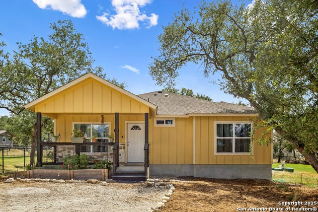 This adorable Hill Country gem offers relaxed living in a peaceful, laid-back community surrounded by nature. Built in 2023 on a gently elevated, tree-covered lot, it features an open-concept layout with warm, stained concrete floors, granite countertops, a breakfast bar, and a well-appointed kitchen with pantry and stainless appliances. Vaulted ceilings create an open, airy feel while keeping its bright cozy charm. The split floor plan provides privacy for the primary suite, while two additional bedrooms offer flexibility for family, guests, or a home office. Enjoy the comfort of central air, durable fiber cement siding with stone accents, and a covered front porch that invites morning coffee or evening sunsets. With low HOA dues of just $50 per year, this home blends modern finishes with country calm-ideal for first-time buyers, downsizers, or anyone looking to simplify without sacrificing style. Homes this charming and move-in ready at this price point don't come along often. Schedule your showing today!