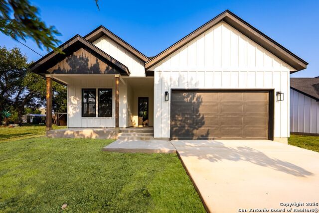 Remarks | $Step inside this newly built stunner- 3 bedrooms, 2.5 baths, with soaring 10 foot ceilings that make every room feel grand. Packed with upscale details, the master suite steals the show with a sliding barn door leading to a spa-worthy bath: double sinks, luxury tile, a seamless walk-in shower with a sleek frameless glass door, a soaking tub for ultimate relaxation and a large walk-in closet. The kitchen is a chef's dream with quartz counters and waterfall island, bold accent cabinetry with distinctive black hardware. Quality craftsmanship is evident with luxury vinyl plank flooring throughout, massive windows flood the space with natural light, and when the nights turn chilly, that fireplace is ready for its close-up. A highly energy efficient home featuring 6" wide exterior walls, with spray foam insulation throughout the entire home and attic. EV-ready plug accessible in the spacious two car garage. Residents of this community enjoy direct access to boat ramp 11 for Canyon Lake, a community pool with a community center, fishing pond, and a pickle ball court. Easy access hwy 281 making it a short distance to San Antonio, Canyon Lake, New Braunfels, and Boerne. Truly a muste see in person. Comes with the standard 1/2/10yr Builder's Warranty. |