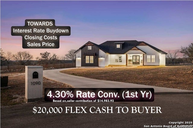 $20,000 FLEX CASH To Buyer! Towards Interest Rate Buydown, Closing Costs, Sales Price! CUSTOM BUILT 2023! 2 MASTER BEDROOMS INCLUDED! RESORT STYLE/COUNTRY LIVING - MUST SEE!!! 1.07 ACRES, ONE STORY, 4 BED 3 1/2 BATH 2,700 SQFT. ON CUL-DE-SAC, ULTRA MODERN WITH ACCENTED HI-CEILINGS, LUXURY WOOD VINYL PLANK AND TILE FLOORS. CUSTOM DESIGNED CHEFS ISLAND KITCHEN, COUNTERTOPS, CABINETS, APPLIANCES. SPECIALLY DESIGNED MASTER BATH WITH CUSTOM BUILT SHOWER, DESIGNER TUB, CLOSETS, CABINETS! PERFECT FOR ENTERTAINING FAMILY AND GUESTS. RELAX ON THE COVERED PATIO OVERLOOKING THE PRIVATE BACKYARD BIG ENOUGH TO ADD A SWIMMING POOL AND MORE OR ENJOY THE SELF CONTAINED BATTING RANGE OUTBACK; ALSO, TAKE ADVANTAGE OF THE GATED COMMUNITY POOL/PAVILION PLUS THE RUNNING/JOGGING/DOG WALKING TRACK AND THE COVERED KIDSCAPE FOR HOURS OF FUN! COMMUNITY AMENDITIES A SHORT WALK AWAY OR DRIVE YOUR GOLF CART DOWN YOUNDER. A PHOTOGRAPHERS DREAM, WILDLIFE, BIRDS, FISH, VEGETATION, CANYON LAKE, MAJESTIC SUNSETS AND SUNRISES! NO COOKIE CUTTER HOMES HERE, NO CITY TAXES, LOTS OF GREAT HOA AMENITIES! MINUTES TO BORENE, SAN ANTONIO, NEW BRAUNFELS, SHOPPING, ENTERTAINING, FACTORY STORES IN SAN MARCOS. LOTS OF SCENIC BACK ROADS AND LITTLE TOWNS NEARBY TO EXPLORE IN CONVERTIBLE, MOTORCYCLE, BIKING, OR BOATING IN CANYON LAKE, HURRY!
