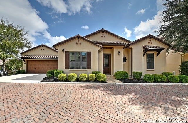 LUXURIOUS ITALIAN VILLA | GATED | SINGLE STORY | 3 BEDROOMS | 2 BATHS Gorgeous stucco villa tucked away in a small 24-home gated community just west of Blanco with charming cobblestone streets and lush landscape. 3 spacious bedrooms with 3 full bathrooms. Gourmet granite kitchen with granite countertops, stainless steel appliances: built-in oven & microwave, gas cook top, refrigerator included, 42" custom cabinetry, Breakfast bar. High ceilings. No carpets: hardwood & ceramic tile floors; Cover patio with extended flagstone patio. Very little landscape maintenance in patio. Excellent floor plan with all 3 bedrooms having great privacy. HOA maintains front common lawn care/landscaping. Conveniently located near 281, 1604, 410, airport, shopping and entertainment. Please verify all measurements and school information. See in additional documents the LENDER-PAID 2-1 Buydown (buyer needs to qualify)