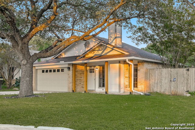Welcome to this inviting home in the desirable Stoneridge neighborhood. This home has been beautifully updated including fresh interior paint, flooring upgrades, light fixture updates and bathroom remodels. The spacious living room features stylish floating shelves and a cozy fireplace with a wood mantle and brick surround. An accent wallpaper wall adds character to the dining room, while ceiling fans in the living area and all bedrooms provide year-round comfort. The kitchen is beautifully appointed with stainless steel appliances, gas cooking and custom cabinetry. The primary suite offers barn doors leading to a private bathroom with a walk-in shower, double vanity, and dual walk-in closets. The front exterior is nicely landscaped, siding has been updated, gutters and the roof has been fully replaced with top of the line materials. Outside, enjoy the covered patio, two fenced in yards and a storage shed. With easy access to Wurzbach Parkway, IH-35, and Loop 410, this home combines comfort, style, and convenience in one great package.