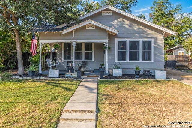 Craftsman style home DOWNTOWN NEW BRAUNFELS! This 1930's home has an updated kitchen to include quartz counter tops and a deep Farmhouse sink, shiplab walls and ceiling accents. Beautiful hardwood floors are in the living room, bedrooms and other common areas. You can enjoy swinging on the front porch swing or relax and entertain in the huge backyard which has many versatile spaces which can be used for a playground, storage, a dog run or to put in a chicken coop. Enjoy a nice walk or drive your golfcart to downtown New Braunfels where you will find dining, shopping and so much entertainment and local events.