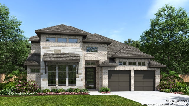 Home office with French doors set at two-story entry. Formal dining room across from staircase. Two-story family room opens to kitchen and morning area. Family room features a wood mantel fireplace wall of windows. Kitchen features deep walk-in pantry, Butler's pantry, 5-burner gas cooktop and large island with built-in seating space. First-floor primary suite includes bedroom with wall of windows. Double doors lead to primary bath with dual vanities, garden tub, separate glass-enclosed shower and two walk-in closets. An additional bedroom is downstairs. A game room and secondary bedrooms are upstairs. Extended covered backyard patio. Mud room off three-car garage.