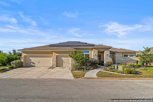 Stunning home located on a corner lot in the prestigious Amorosa section of Cibolo Canyons! This exquisite residence combines a prime location with an impressive array of eco-friendly features and modern luxuries that will captivate you from the moment you step inside. Designed for the environmentally conscious homeowner, this energy-efficient haven boasts solar panels clearly visible on the roof that dramatically reduce utility costs while minimizing your carbon footprint. The tankless water heater provides endless hot water on demand, while the whole house water softener ensures every drop is perfectly conditioned throughout your home. Upon entering through the striking modern front door with decorative glass panels, you'll immediately notice the meticulous attention to detail that sets this home apart. Rich hardwood floors flow seamlessly throughout the open-concept living spaces, creating warmth and elegance. Featuring two secondary bedrooms that share a convenient Jack and Jill bathroom plus a spacious primary suite, there's plenty of room for relaxation and entertaining. Each bedroom is designed to offer a peaceful and comfortable retreat, ensuring an exceptional experience for both you and your guests. One of the home's most remarkable features is its proximity to one of the area's top-rated golf courses, with stunning views of the pristine fairways visible from your beautifully landscaped backyard. The expansive corner lot is perfectly manicured with lush green lawn and mature trees, all enclosed by elegant black decorative fencing for privacy and security. The heart of the home is the gourmet kitchen, designed with culinary enthusiasts in mind. The massive granite island serves as both a workspace and gathering spot, while rich dark cabinetry extends to the ceiling for maximum storage. Stainless steel appliances and an oversized farmhouse sink complete this chef's dream. Exquisite pendant lighting and modern fixtures throughout create perfect ambiance for both cooking and entertaining. The open-concept family room flows seamlessly from the kitchen, featuring soaring ceilings and a stunning stone fireplace that serves as the room's centerpiece. Large windows flood the space with natural light while offering beautiful views of the golf course beyond. The owner's retreat is a spa-like sanctuary, complete with a luxurious en-suite bathroom featuring dual vanities with granite countertops, a soaking tub, and a spacious walk-in shower with elegant tile work. The expansive walk-in closet provides ample storage for even the most extensive wardrobe. Additional highlights include a versatile office/study space, crown molding throughout, and a three-car garage with built-in storage solutions. The covered patio extends your living space outdoors, perfect for enjoying the serene golf course views and entertaining guests year-round. This isn't just a home-it's a smart investment in sustainable luxury living with unparalleled golf course lifestyle. Welcome home! Also Includes Washer, Dryer and Refrigerator.