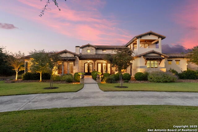 This stunning home is nestled on 1.16 resort-like acres and seamlessly blends Santa Barbara elegance with Hill Country charm creating a timeless allure inside and out! The Mediterranean and Spanish infused stylings complement each other striking the perfect balance between grandeur and warmth. The inviting foyer is a welcoming introduction boasting sophisticated, distressed wood beams and a set of double glass doors that open to an intimate courtyard with a soothing water feature. Walls of windows, transoms and glass doors provide natural lighting throughout creating warm and inviting spaces. Refined finishes include art niches with accent lighting, designer chandeliers and fixtures, crown mouldings, wood-like tile flooring in a herringbone pattern, furniture style cabinetry and detailed ceiling treatments. For a theater style experience there is a 5.1 surround sound system in the great room and game room. There are additional speakers in the dining room, master bedroom and main outdoor patio for listening to your favorite music while relaxing or entertaining. The great room boasts distressed wood beams, a soaring floor to ceiling stone fireplace, a custom built-in entertainment piece and a set of sliding glass doors opening to al fresco living spaces. The keen chef will appreciate the gourmet island kitchen that is well-equipped with upscale Jenn-Air stainless steel appliances including a 6 burner gas cooktop, built in refrigerator/freezer and a breakfast bar with under island storage cabinets. In addition, there is a wet bar complete with a sink and disposal, a secondary dishwasher drawer, U-line beverage cooler, built-in wine glass rack and custom cabinets! A butler's pantry services the formal dining room and boasts an abundance of storage cabinets. A haven of relaxation, the owner's retreat features outside access, natural lighting and serene backyard views. The spa-infused bath boasts separate vanities, plus a sitting vanity, garden tub, a seamless glass shower with multiple shower heads and a sprawling custom wardrobe room with a secondary laundry room. The private study and three spacious bedrooms, each boasting a walk-in closet complete the lower level. Upstairs is the spacious game room with outside access to a private balcony, a walk-in storage closet and a partial bath. For year-round enjoyment, the inspirational backyard oasis will not disappoint and is reminiscent of a private resort! There are multiple areas that are perfect for entertaining! The sprawling pool takes center stage! Details include a soothing water feature, adjoining spa, lounging deck and is surrounded by professional landscaping and open sitting areas. A picturesque cabana with a beautiful stone, wood burning fireplace borders the pool area. Additional appointments include a spacious covered patio, an additional covered patio with an outdoor kitchen and built-in grill, firepit area and a treehouse! The sprawling lawns boasts an abundance of mature trees and are ideal for leisure and play! For housing your vehicles, the attached 3-car garage affords ample space for your vehicles and includes epoxy flooring, storage space and workshop area with a sink. Set within the gated community of Stone Creek Ranch, residents also enjoy access to neighborhood amenities including a resort-style pool, clubhouse, and playground, offering the perfect blend of privacy, comfort, and community connection. You'll simply love coming home to this superb property!