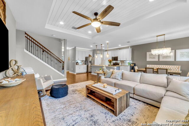 Remarks | $Designer details and upgrades shine in this beautiful former model home! Located in the sought-after Ridgemont community in New Braunfels, this gorgeous home is packed with designer touches and thoughtful details throughout. The primary bedroom and private office are conveniently located on the main floor, while three spacious bedrooms and a second living area await upstairs - perfect for family or guests. The climate-controlled garage with its own HVAC system is a rare plus - ideal for hobbies, workouts, or extra storage. You'll love the gleaming wood floors in the main living areas, office, and kitchen; plush carpet in the bedrooms; and tile in the baths and laundry room for easy care. Enjoy a wide open floorplan filled with natural light streaming through walls of windows. Elegant shiplap tray ceilings in the living room and primary suite, plus a stylish shiplap accent wall in the primary bedroom, add charm and character. Step outside to your covered back patio overlooking mature trees and peaceful green space - with no neighbors behind! Residents enjoy access to the community pool and all the charm of New Braunfels living. |