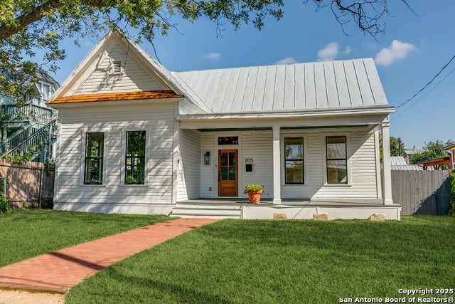 Experience luxury living in this beautifully remodeled Southtown gem. This 1930 Folk Victorian home blends timeless charm with modern elegance, offering 1,974 square feet, three spacious bedrooms, and two and a half baths. A grand foyer welcomes you with striking herringbone wood floors, brass statement lighting, and a custom stained-glass transom window. The open-concept kitchen, dining, and living area features vaulted ceilings and custom beams-perfect for entertaining or everyday comfort. The chef-inspired kitchen includes GE Monogram appliances, abundant cabinet space, an oversized island, and Calcutta Idlillo quartz countertops. Retreat to the primary suite, where Carrara marble finishes, a soaking tub, separate glass shower, and dual vanities create a serene escape. Two additional bedrooms with soaring ceilings share a stylish bath with double sinks, ideal for guests, a home office, or media room. A bold powder room adds a touch of sophistication, while the rear-entry mudroom and separate laundry room enhance functionality. Enjoy outdoor living with a spacious covered front porch with view of the Pioneer Flour Mill towers. The backyard is an extension of the home with side-to-side covered patio with ceiling fans, designer lighting and privacy screens. The automatic gate leads to secure rear parking. This renovation includes all-new plumbing, electrical, HVAC, insulation, sheetrock, doors, flooring and roofing in select areas, for decades of enjoyment. Situated in the Nathan Historic District next to King William, 205 ER. Rische, holds local landmark status as the residence of L.C. Skinner. You'll love walking to the Blue Star Arts Complex, Guenther House, the Riverwalk, and everything Southtown has to offer. This is your opportunity to own a true piece of history-updated for modern living. Schedule your private tour today.