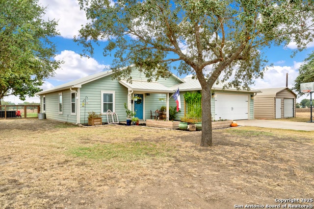 Welcome home to this beautifully maintained farmhouse-style property offering the perfect blend of small-town charm and modern comfort. Just 30 minutes from San Antonio, this home provides easy access to the city while feeling worlds away. Enjoy the peace and quiet of the countryside - during crop season, you'll hardly see a neighbor, making this property feel private and secluded. Inside, you'll find an inviting layout with an eat-in kitchen featuring stainless steel appliances, ceiling fans in every room, and farmhouse touches throughout, including wooden shutters on every window. The ranch-style fenced backyard is perfect for relaxing or entertaining, with a covered patio, playscape, garden area, dog run, and storage shed. A two-car garage, new roof with gutters, and automatic dusk-to-dawn lighting add comfort and convenience. Experience quiet country living just a short drive from the city - this home truly has it all.